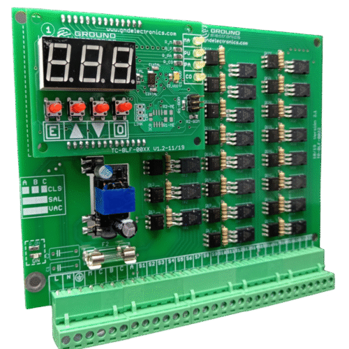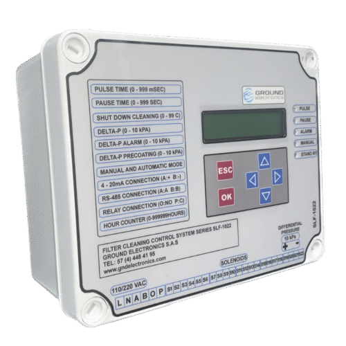 Este controlador electrónico al igual que el controlador BLF-0022 es autónomo, programable y realiza el control de la limpieza en filtros de mangas de acuerdo a la configuración del tiempo de apertura de las electroválvulas y del tiempo de retardo entre aperturas.